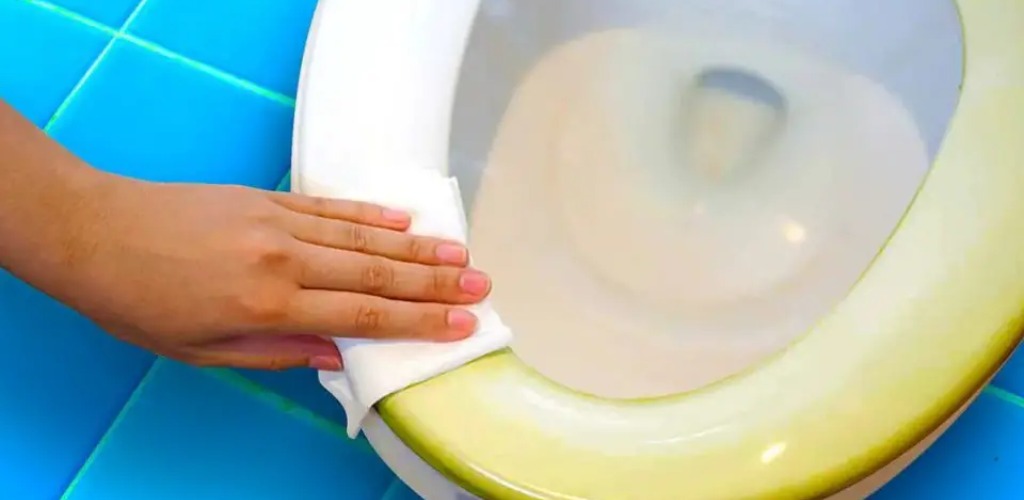 To put these ingredients to good use, the steps are very simple. Start the cleaning process by first applying an antibacterial cleaner to the toilet seat, let it sit for 10 minutes, and then wipe with a damp cloth.