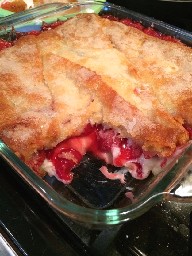 First unroll the crescent rolls dough and fill with 2 tbsps of cherry pie in each one then roll up the dough.