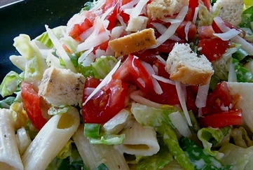1 pound dry penne pasta 1 tablespoon butter 6 breast half, bone and skin removed (blank)s skinless, boneless chicken breast halves – cut into 1 inch cubes ½ teaspoon ground black pepper ¼ teaspoon salt 1 (8 ounce) bottle Caesar salad dressing ¼ cup red wine vinegar ½ cup grated Parmesan cheese 1 head romaine lettuce – rinsed, dried and shredded 1 large tomato, chopped