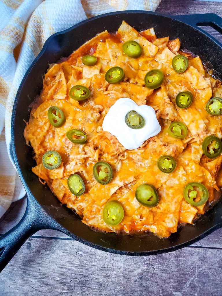 A chicken enchilada skillet casserole is a one-pan meal that features chicken, cheese, and a zesty enchilada sauce. It is easy to make and can be on the table in less than 30 minutes.