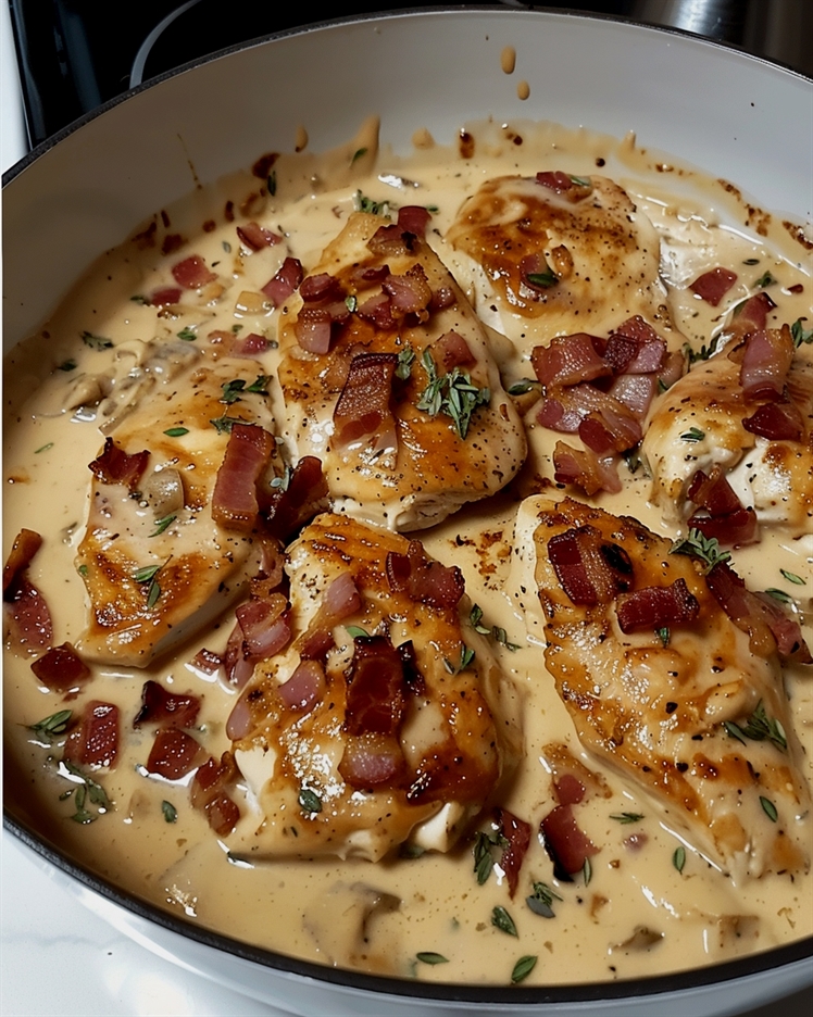 Get ready to tantalize your taste buds with this heavenly combo of chicken, cream, and bacon! Even those who aren’t usually fans of cream have been won over by this deliciously decadent dish. Each bite of the golden-brown, pan-fried chicken is a delight, melting in your mouth with a burst of flavors. And the bacon… it simply takes the dish to a whole new level of yumminess!