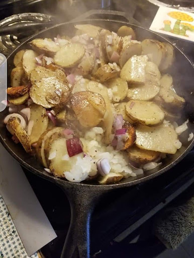 - Continuously turn and flip the potatoes and onions to ensure they brown evenly. Be careful not to flip them too much, as it may cause them to break apart. Allow them to cook a bit before flipping each time to achieve the desired crispiness.