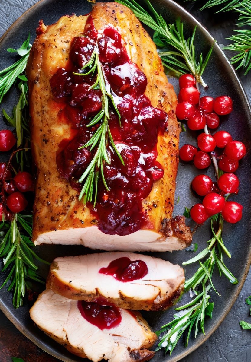 Serve this delightful dish with extra cranberry sauce, garnished with dried cranberries and parsley for an added festive touch.