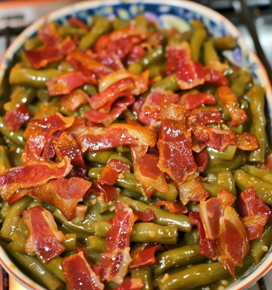 The recipe calls for 1 pound of trimmed fresh green beans and 2 cloves of minced garlic.The recipe calls for 1 cup of chicken stock, or enough to cover the beans. Season with salt and black pepper on an individual basis.The recipe calls for four to six pieces of chopped bacon, two tablespoons of optional butter for extra richness, a teaspoon of optional red pepper flakes for spice, and one medium sliced onion.