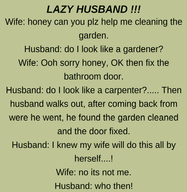 Then husband walks out, after coming back from were he went, he found the garden cleaned and the door fixed.