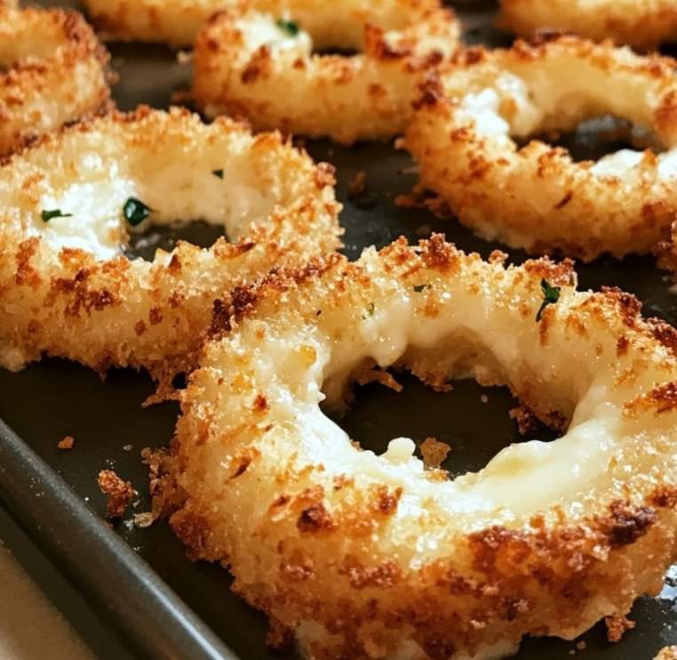 Baked mozzarella onion rings are a delicious snack that mixes melted mozzarella cheese with crunchy onion rings. This recipe is a fun variation of classic onion rings and is great for family game nights, parties, or as a tasty appetizer for your next get-together. They are cooked in the oven instead of in oil, which makes them a bit healthier without losing any flavor. This meal will be loved by both children and adults!
